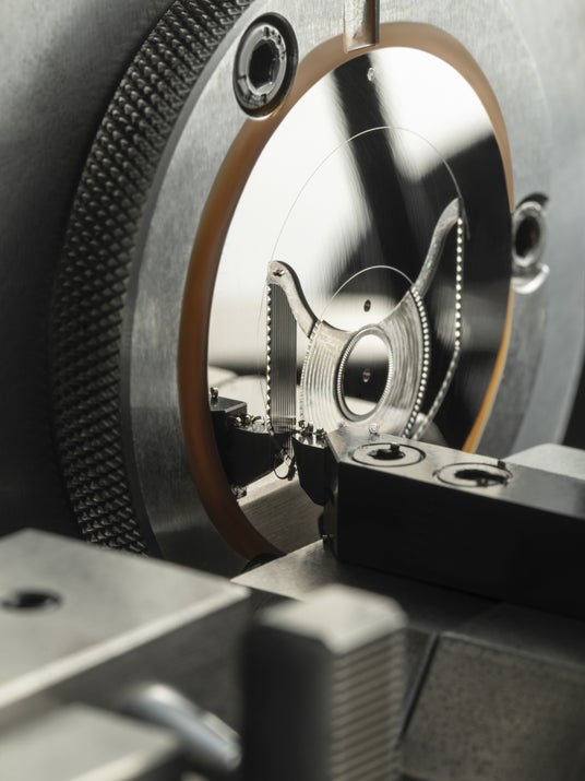 こうした昔ながらの技法では、当然ながら、生産数に限りがあります。「トゥールビヨン プラチナ」のダイアルを1枚完成させるには、1人の名ギョーシェ職人が1筋1筋刻み込んで最大3日かかり、工程のどこかに些細なミスが1つでも見つかれば、ダイアルを廃棄しなければなりません。