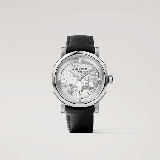 プラチナで仕上げた「エスカル」。複雑でありながら洗練されたディテールが、メゾンのアイコニックなトランクの装飾を彷彿させます。精緻な技術の粋を讃える自動巻き「キャリバーLFT023」を搭載し、メテオライトのダイアルで彩った時刻表示のみの3針モデルです。