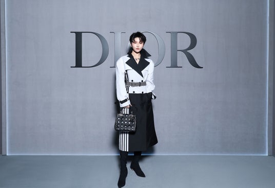 リウ・ユーシンは、2025年春夏 コレクションからブラックとホワイトのコットントレンチコートを纏い、ディオールのアクセサリーを合わせました。