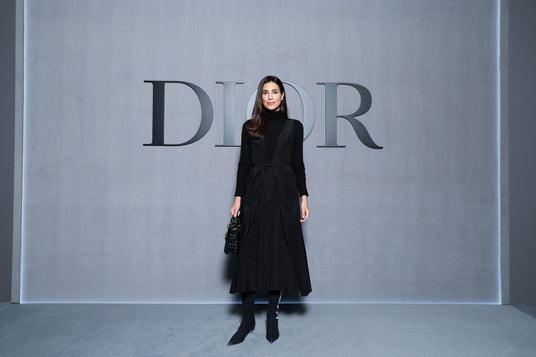 アレッサンドラ・デ・オスマは、2025年春夏 コレクションからブラックウールとシルクのドレスに、ブラックのカシミアトップスを纏い、ディオールのアクセサリーを合わせました。