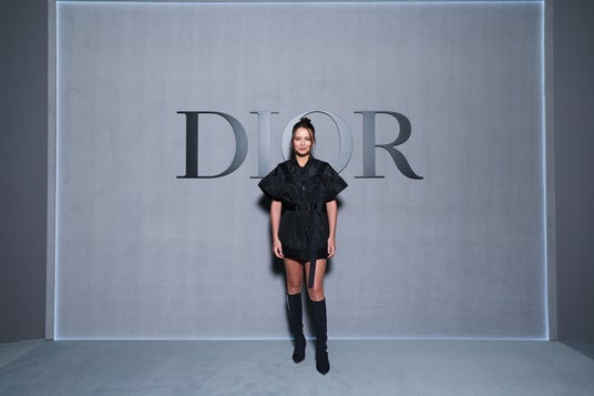 ナディア・テレスキエヴィッチは、2025年春夏 コレクションからブラックシルクのトップスとスカート、その上にブラックのコットンジャケットを纏い、ディオールのアクセサリーを合わせました。