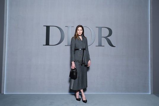 ミシェル・モナハンは、グレーのウールジャケットとスカートを纏い、ディオールのアクセサリーを合わせました。