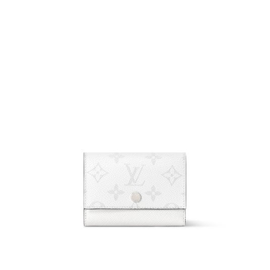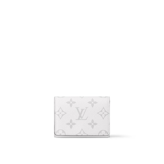 ホワイトのモノグラム・キャンバスとタイガ・レザーを組み合わせ、コントラストを効かせたブラックのカウハイドレザーのライニングを施したカードケース「アンヴェロップ・カルト ドゥ ヴィジット」。あらゆるポケットやバッグにすっきり収まるなめらかなデザインも魅力です。スナップ付きのフラップを開けると、コンパートメントとカードスロットが現れます。
