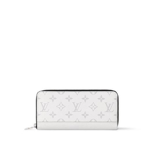 タイガ・レザーと明るいホワイトのモノグラム・キャンバスを組み合わせた「ジッピーウォレット・ホリゾンタル」。ラウンドファスナー開閉式の実用的なデザインに、ファスナー付のきセンターポケットと、各サイドに6つずつ並べたカードスロット、紙幣や領収書用の2つのフラットポケットを備えています。内装に施したブラックのカウハイドレザーのライニングも魅力。