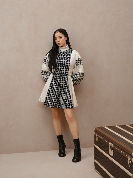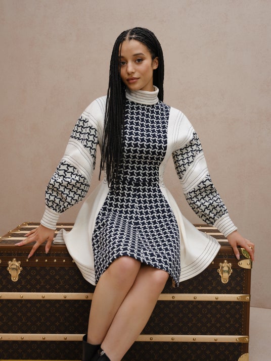 チェイス・インフィニティは、彼女とルイ・ヴィトンを結び付ける共通の価値観に共鳴しながら、メゾンの力強く、タイムレスなフェミニニティを完璧に体現する存在。ルイ・ヴィトンとは2024年以来関係を深め、直近では2回のファッションショー(ニコラ・ジェスキエールによる2025秋冬および2026春夏ウィメンズ・コレクション。後者は去る9月にルーヴル美術館で発表)にも出席しました。また、映画『ワン・バトル・アフター・アナザー』のワールドプレミアでは、1860年のアーカイヴから着想を得た、エンブロイダリーが際立つルイ・ヴィトン特注のシャンパンカラーのサテンドレスをまとって登場。メゾンとの絆は、今年10月にロサンゼルスで開催された第5回アカデミー映画博物館ガラでもさらに深まり、オーバーステッチのプリーツが施されたガーメントダイ(製品染め)のグリーンのシルクタフタ ビスチェドレスを着用しました。