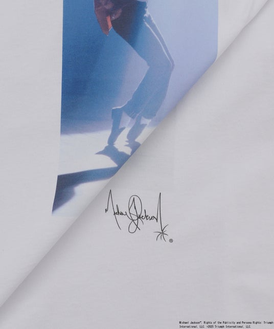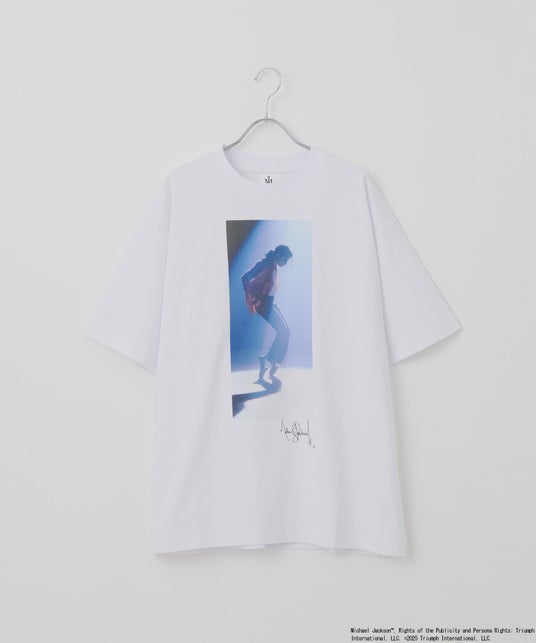 ■011 ホワイトA 象徴的な先立ちポーズのイメージを切り取った1枚。スポットライトに照らされた躍動感あるグラフィックがスタイリングの主役になるデザイン。裾部分にはサインプリント入りでファン心をくすぐる仕上がり。
