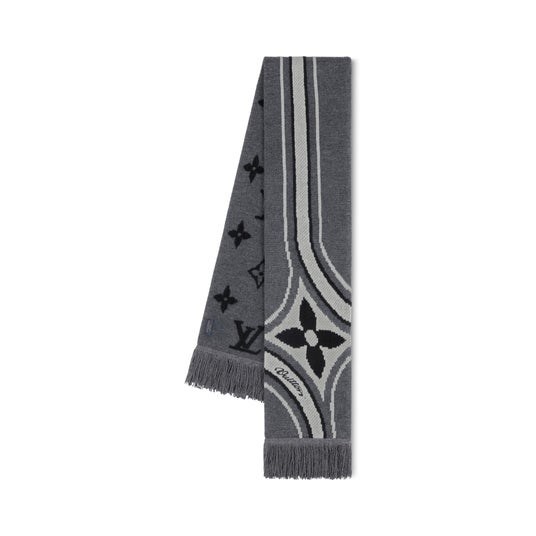 シックなグレーのデザインにブラック&ホワイトの曲線とモノグラム・フラワーをあしらったイタリア製の「マフラー・グラフィック フラワー」。メンズ・プレタポルテに登場する手書き風の「Vuitton」シグネチャーを内側にさりげなく配しました。柔らかで暖かなウール混紡素材を使用し、たっぷりと施されたフリンジが心地よい質感を引き立てます。
