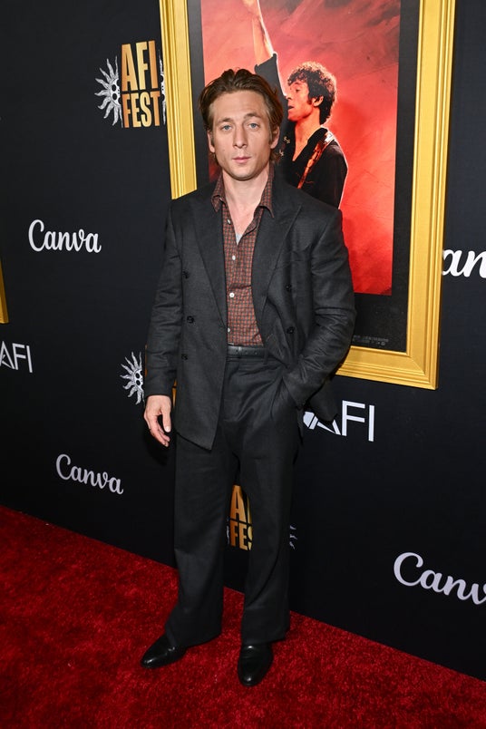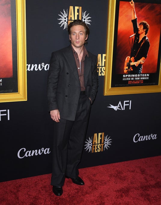 ジェレミー・アレン・ホワイトは、ダークグレーのカシミヤとウールを混紡したダブルブレストスーツに、マルチカラーのフランネルシャツ、ブラックのレザーベルト、ブラックのレザーブーツを合わせました。