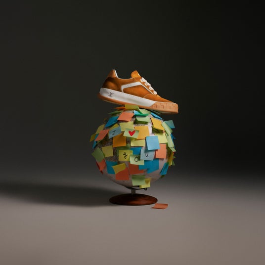 鮮やかな色合いをスプレー仕上げで際立たせた、スエードレザー製の「LV ティルテッド スニーカー」。グラフィカルなホワイトのトリミングとシューレースが、2000年代初頭の大胆なデザインを彷彿させます。一目でルイ・ヴィトンと分かる傾いたLV イニシャルのシグネチャーをシュータンとアウトソールにあしらいました。