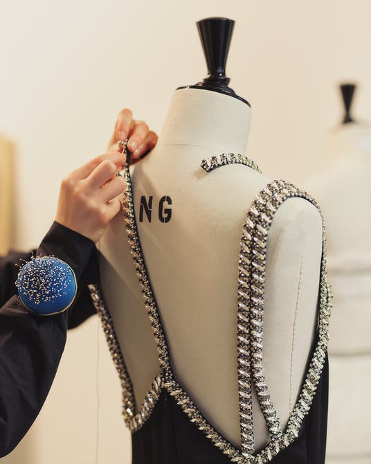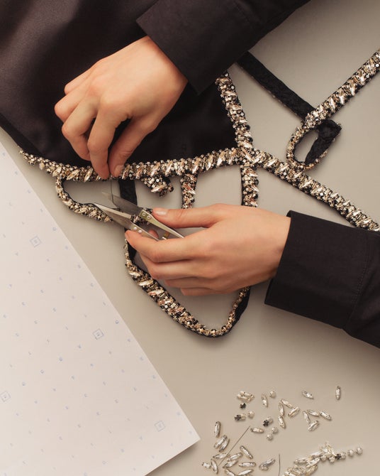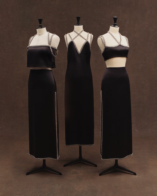 エスティ、アラナ、ダニエル・ハイムが着用したドレスは、マルチストラップと幾何学的な3Dクリスタル刺繍が施され、刺繍は、楕円形のクリスタル、丸みのあるスモークドスワロフスキー、スクエア型のダークストーンを組み合わせ、メタリックと透明のマイクロビーズで縁取った、シャープなラインの幾何学的3Dデザインが特徴です。