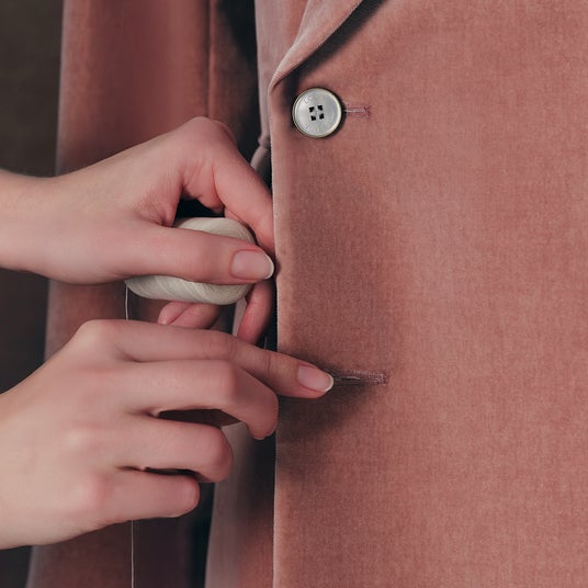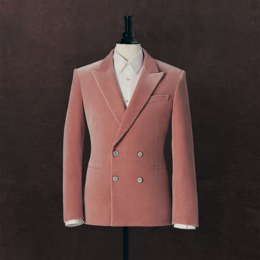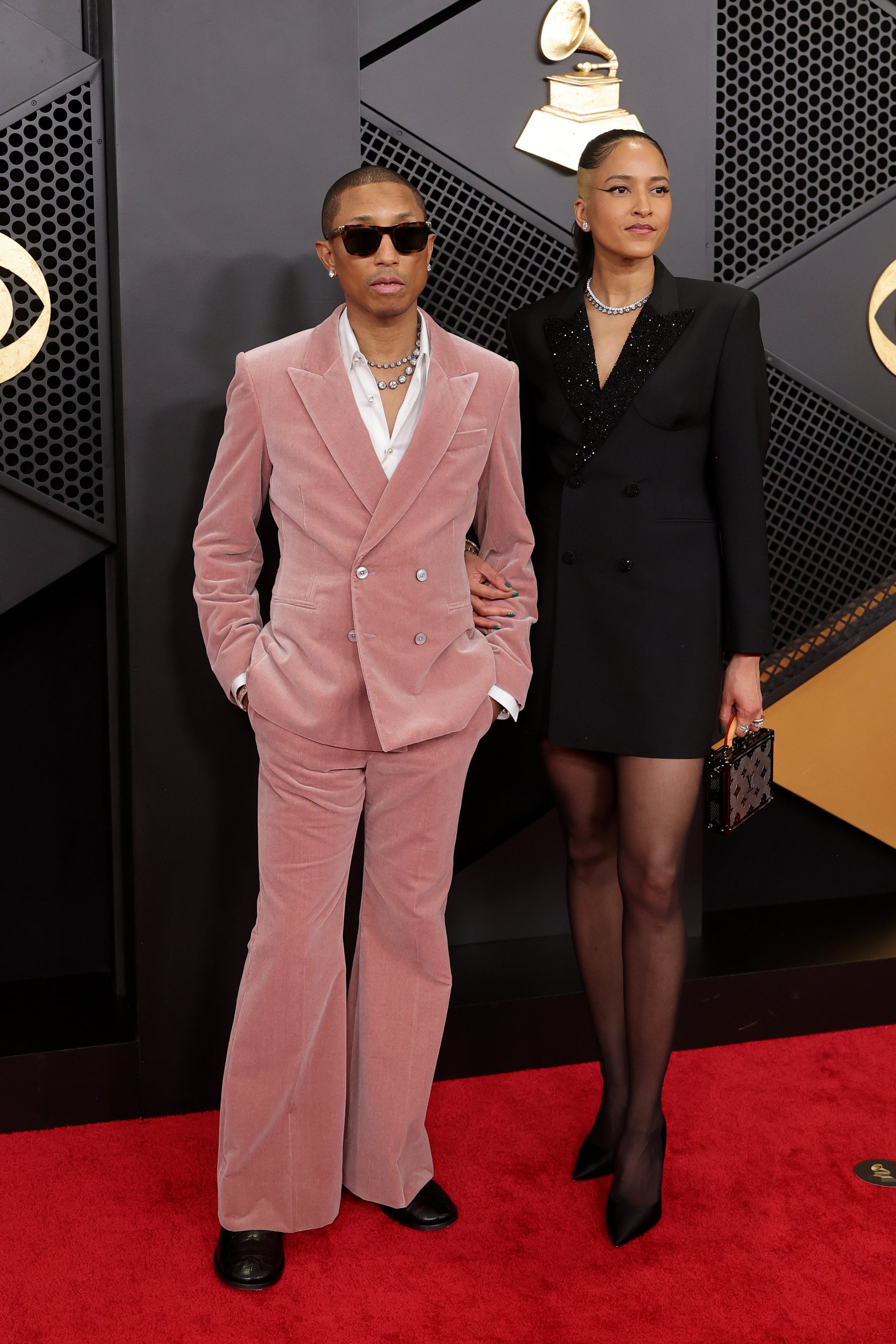 ファレル・ウィリアムスとクリプスがレッドカーペットで着用したウェアは、コットンとシルクのピンクベルベット素材で仕立て、シルクの裏地とマザー・オブ・パール ボタンを使用し、各ジャケットの内側にはカスタムのジャカードラベルが付いています。