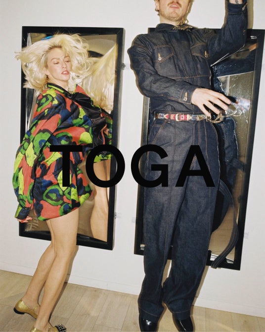 「TOGA(トーガ)」大きくカーブしたミラー、特徴的なテキスチャーの壁やミラータイル什器が組み合わさった店内には人気のアクセサリー、レザーグッズ、シューズやウェアが並ぶほか、リニューアルオープンを記念した阪急うめだ店限定商品を発売。ブランドの象徴的なスタッズとウェスタンディティールで装飾されたショートスリーブドレスと開襟シャツはキュプラ素材のTOGAらしい2型の展開。
