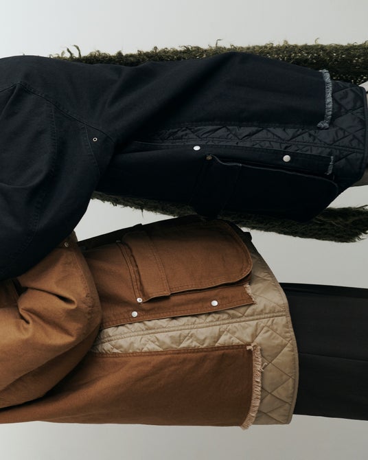 本体が断ち切られて下からキルティングライナー見える再構築な仕様が特徴で、前身頃は本体とライナーの2層になっているので、脇のドットボタンを外してライナー側のポケットも使用可能です。
