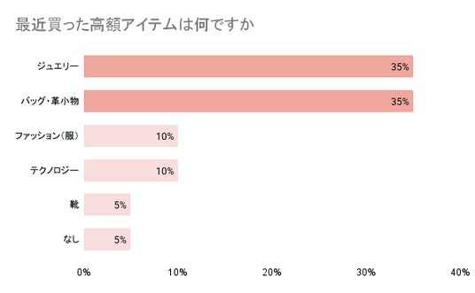 ジュエリーやバッグ・革小物が圧倒的多数で、「30歳の記念にヴァン クリーフ&アーペルのネックレスを買いました」「彼と兼用でTHE ROWのマルゴーを購入」など、節目買いやカップルでの兼用などといった声が寄せられました。また「リモワのバレリーナ ピンクのキャビンを購入し、ネームタグ、タイヤもカスタムしました」など、アクティブライフをサポートしてくれるようなアイテムの購入も見られました。これらの結果から、賢くお金の運用をしながら、自身のQOL向上のために大きな買い物をする層だということが分かります。