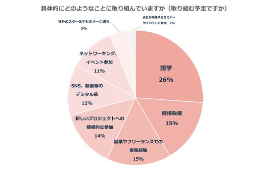 また、キャリアアップのために具体的に取り組んでいること(取り組む予定)としては、「語学」(26%)、「資格取得」(15%)、「副業やフリーランスでの実務経験」(15%)と続き、現在の仕事に活かせるだけでなく、この先のキャリアに繋がることに幅広く取り組んでいることが分かります。