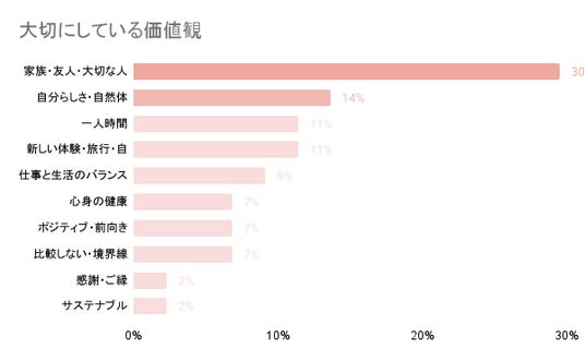 大切にしている価値観について、「家族・友人・大切な人との時間」が3割を占めており、回答者にとって最も重視されている要素であることが分かります。次いで、「自分らしさ・自然体」「一人時間」「新しい体験・旅行・自然」がそれぞれ11%~14%程度で、自己の内面的な充足やアクティブな経験へのニーズが高いことが示されています。