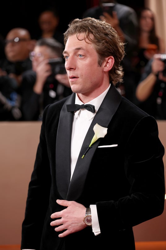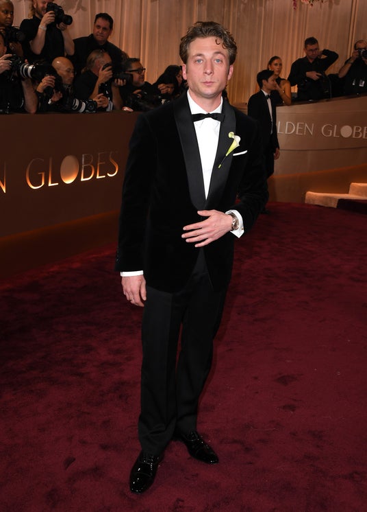 ジェレミー・アレン・ホワイトは、ブラックのショールカラータキシードジャケットに、ブラックのパンツ、ホワイトのドレスシャツ、ブラックの蝶ネクタイ、ホワイトのポケットチーフ、ブラックのパテントレザー ダービーシューズをコーディネートしました。