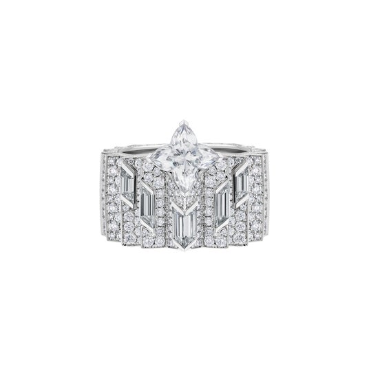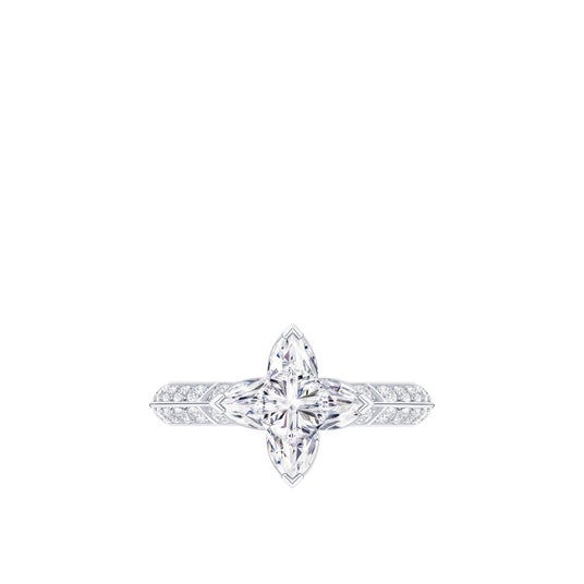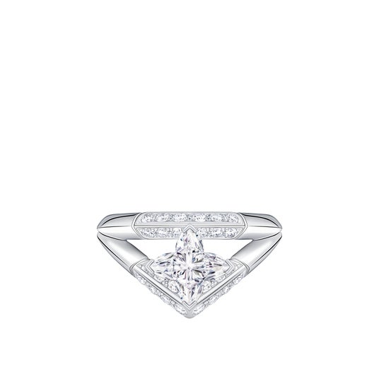 また、メゾンのハイジュエリー・コレクションより、ホワイトゴールドとダイヤモンドのネックレス「ピュア V」、さらにファインジュエリー・コレクション「LV ダイヤモンド」より、パヴェダイヤモンドをあしらったダブルリングとソリテールリング2点も着用しました。