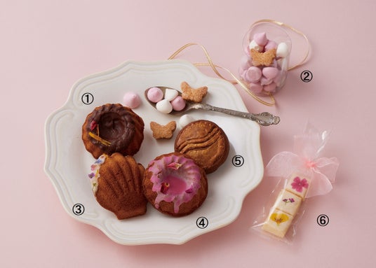 「菓子屋フーク」「菓子屋フーク」1.チョコクグロフケーキ(1個入り)451円、2.メレンゲBOX(20g入り)371円、3.お花のマドレーヌ(1個入り)371円、 4.フランボワーズクグロフケーキ(1個入り)451円、 5.ココアガレットブルトンヌ(1個入り)321円、6.お花のショートブレッド(3個入り)321円