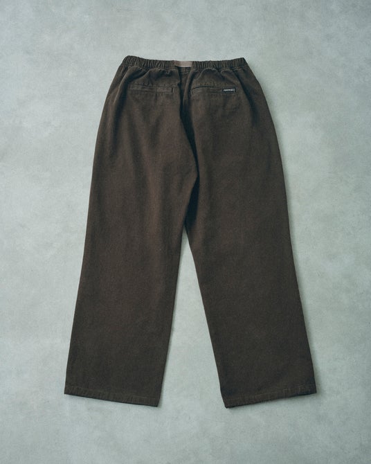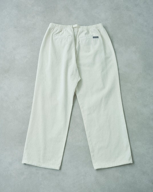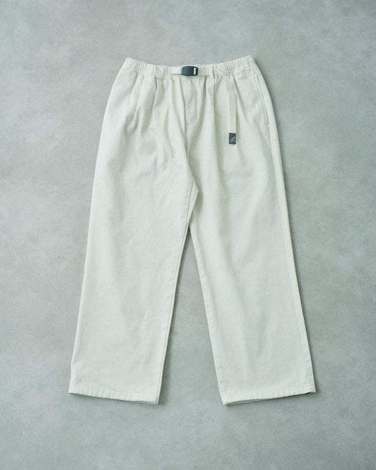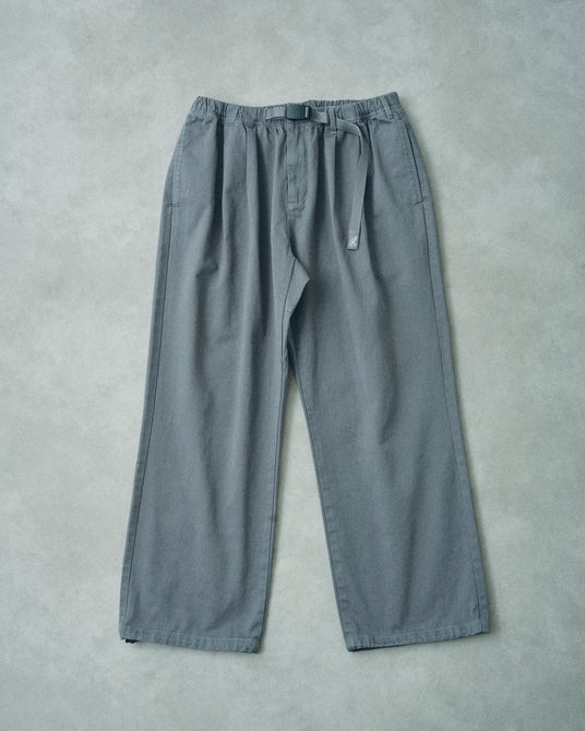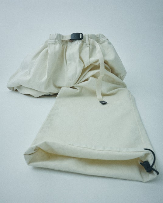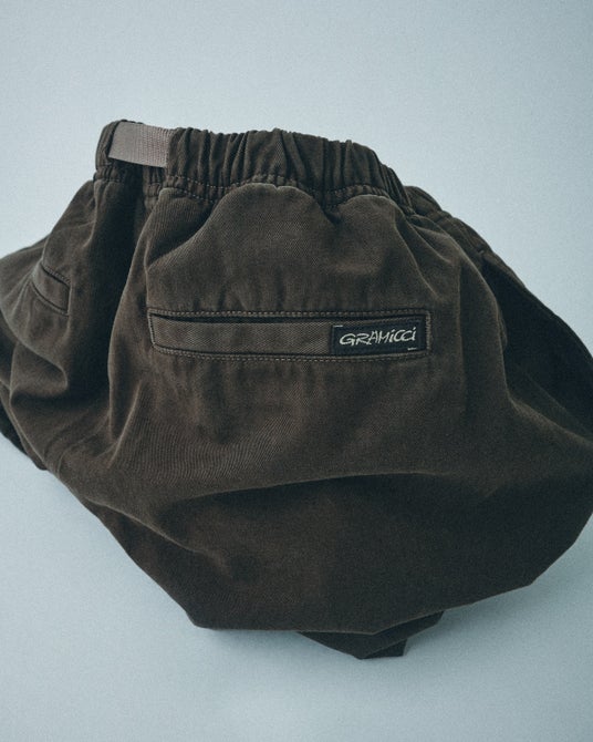 製品染めとバイオウォッシュを施すことで、ヴィンテージライクな風合いと奥行きのある表情を表現しています。シルエットは裾幅を大きく調整し、リラックス感のあるワイドフィットにアップデート。ラフさがありながらも、都会的なムードを纏うバランスに仕上げています。Gramicciのアイコンであるガゼットクロッチやウェービングベルトといった機能的ディテールはそのままに、relumeらしい洗練されたデザインアプローチを融合。バックポケットの刺繍やベルトロゴはボディと同色でまとめ、さりげないアクセントとして効かせました。また、気の利いたベルトループを追加することで、キーホルダーやウォレットチェーンを装着でき、自分らしいアレンジで個性を演出しながらファッションを楽しめる仕様に。裾にはドローコードを配置し、シルエットの変化も楽しめます。機能性とファッション性、そしてサステナブルな素材選定。今の時代に、ファッションを再燃させる一本です。