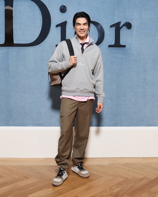 エイサップ・ロッキーはライトブルーのデニムシャツに、レッド、ネイビー、グリーンのシルクタイを合わせ、ネイビーのデニムパンツを着用しました。また、シーラ・ヒックスにより再解釈された「レディ ディオール」バッグとブラウンレザーのダービーを合わせました。