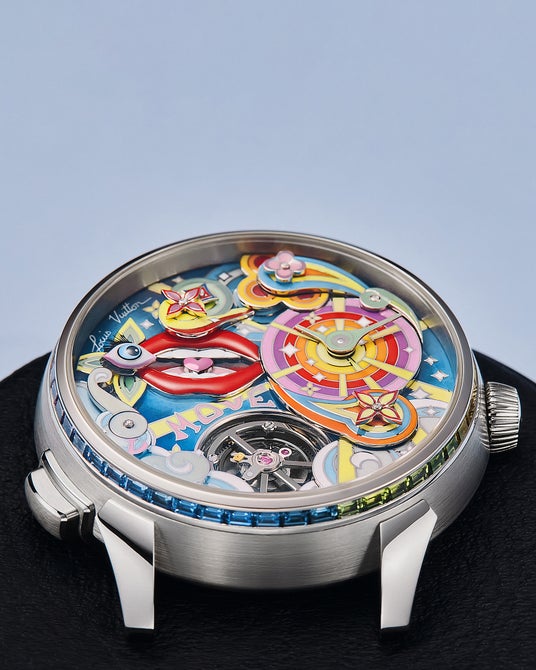 独創的なデザインセンス、卓越したサヴォアフェール、技術的な妙技を融合させた「タンブール タイコ アーティー・オートマタ」は、ルイ・ヴィトンの最も大胆なハイウォッチメイキング ピースのシグネチャーを余すところなく結集しています。モノグラム・フラワーのパワーが弾ける、遊び心に満ちたクリエーションは、ポップな感性をまとった虹色の夢の世界の中で、躍動する愛を描き出します。