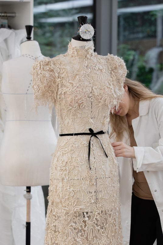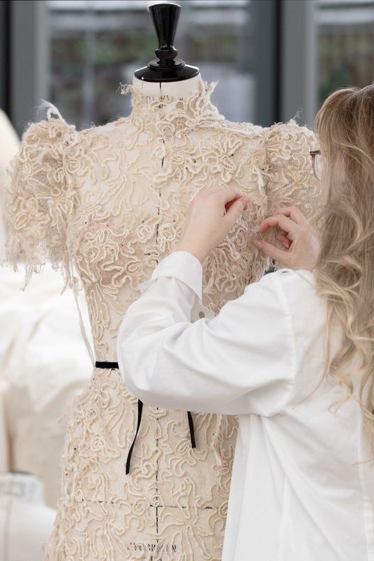 ハル・ベリーは、2025年春夏コレクションより、レーススリーブにグレーウールに刺繍をあしらったドレスを纏いました。メイクアップはディオール ビューティです。