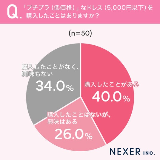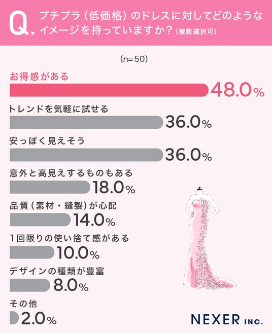 今回の調査では、ドレスの予算として「10,000円~20,000円未満」が最多である一方、プチプラドレスを購入したことがある方も40%いることがわかりました。「お得感がある」というポジティブなイメージが最も多かったものの、「安っぽく見えそう」という不安も同じくらい見られます。