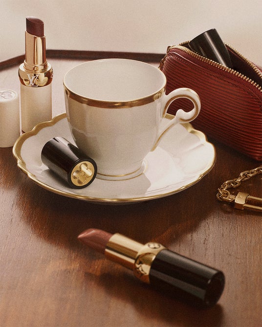 ウンミ・モサクは、「LV オンブル 896 モノグラム・ルージュ」で目元を引き立て、軽やかなヴェールのようにのせた深みのあるバーガンディブラウンの「LV バーム 051 モノグラム・タッチ」と、温かみのあるピーチトーンの「LV ルージュ 103 バニティ ベージュ」を重ねて唇を彩りました。