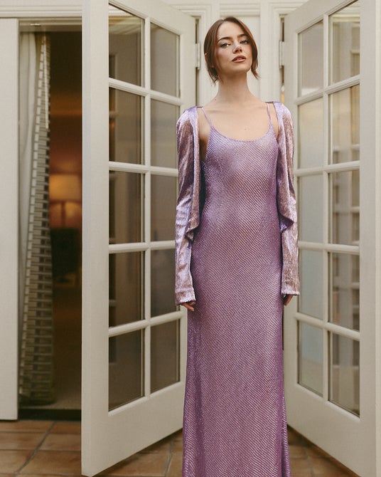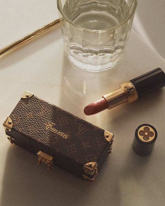 メゾンのアンバサダーであるエマ・ストーンは、「LV オンブル 250 ヌード ミラージュ」で目元を際立たせ、クールなアンダートーンを持つ繊細なモーヴピンクの「LV ルージュ 104 ベージュ マキナ」を纏いました。
