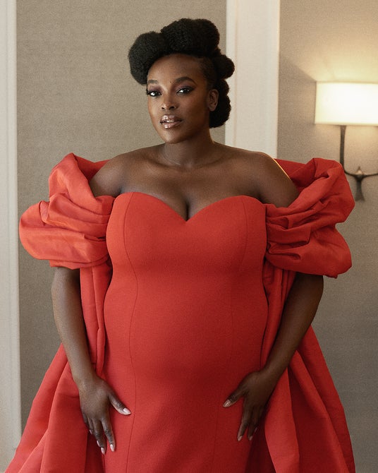 エリン・ドハティは、「LV オンブル 650 ウェイキング ドーン」のパレットと、温かみのあるアンダートーンを持つ洗練されたベリーニピンクの「LV ルージュ 102 パスポート トゥ パリ」を合わせました。