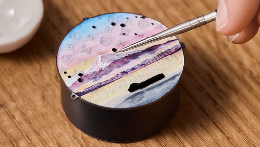 卓越したエングレービングに呼応するように、「エスカル・オ・モン・フジ」には多彩なエナメル技法が用いられています。グラン・フー エナメル、シャンルベ、パイヨン、ミニアチュール・エナメルなどが含まれます。最初の工程は、このウォッチのグワッシュ画に合わせ最適な色とトーンを選定すること。ダイアルには合計33色のパステルカラーが使用され、各エナメルの色味は細かく砕いて水と混ぜ合わせてから塗布されます。その後、塗り重ねるたびに焼成を繰り返し、ダイアルの完成までには合計40回の焼成を要します。そのたびにひび割れのリスクが伴いますが、万一ひび割れが生じた場合は、最初からやり直さなければなりません。