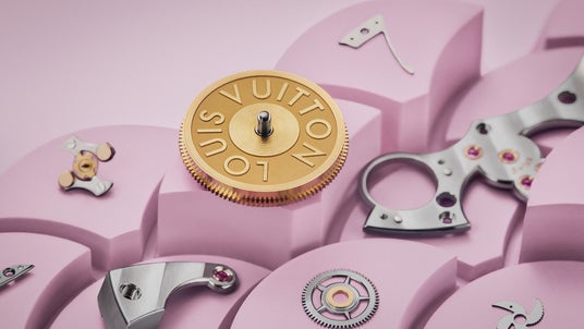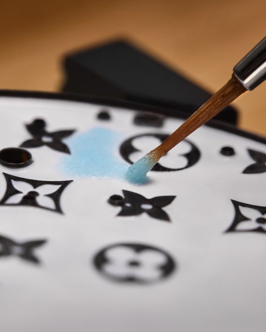 ダイアル上の最も崇高で魅惑的な意匠の1つが空です。ピンクとブルーのグラデーションにイエローのエナメルが重なり、春の夜明けの情景を想わせます。ルイ・ヴィトンのモノグラム・フラワーが空にアクセントを添え、わずかに起伏を持たせた仕上げによって立体感を生み出しています。