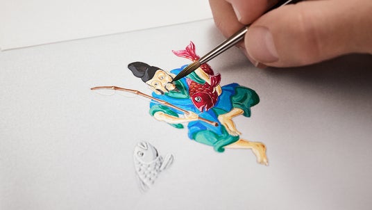 最後にフォンダンエナメルの釉薬を情景全体に施し、丹念に研磨することで、さらなる奥行きときらめく透明感を生み出します。多彩なエナメル加工における工程と技法には、合計300時間にもおよぶ精緻な職人技が注がれました。