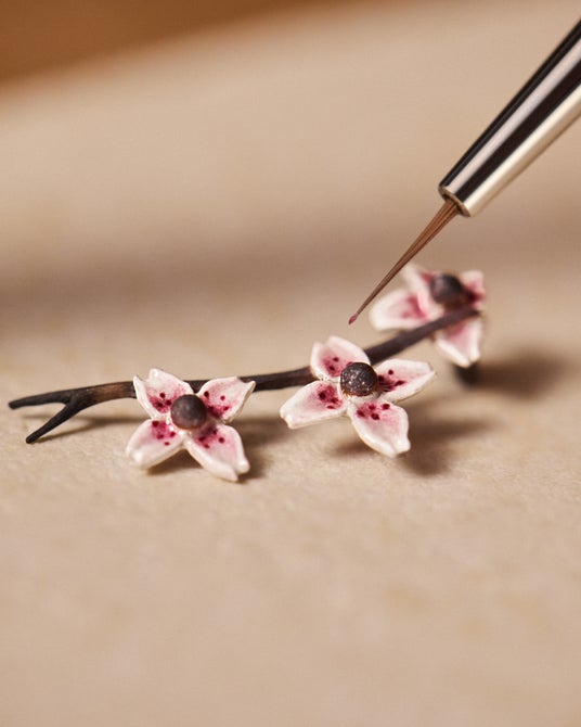 富士山の前景に配された桜は控えめな構図ですが、これを実現するのは至難の業です。イエローゴールドにセットされたこれらの桜は、焼成の際に精密な制御を必要とします。焼き過ぎは酸化を招き、エナメルの色調が変化してしまうため、各工程は事前の綿密な計画のもと、色の安定性と仕上げの洗練性にとりわけ注意が払われました。