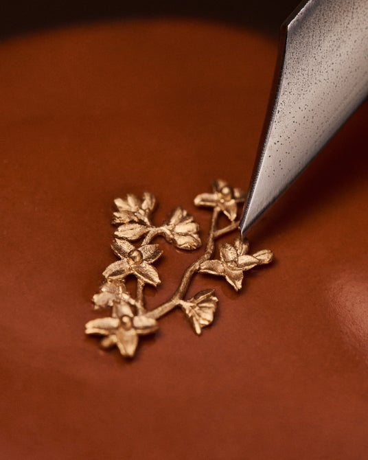 最後に、ダイアル上のミニチュアの立体的な要素にもエナメルが施され、下地のエングレービングにさらなる生命感と奥行き、そして美しさを加えています。ルイ・ヴィトンのモノグラム・フラワー モチーフをさりげなく取入れて彫刻された9つの桜の花は、淡いピンクからピンク、レッドへと移ろう繊細なグラデーションで色付けされ、生き生きとした透明感と共に、写実的でありながらも優美な佇まいで表現。磨き上げられたイエローゴールド製の花芯が、エナメル細工の中で一際輝きを放ちます。