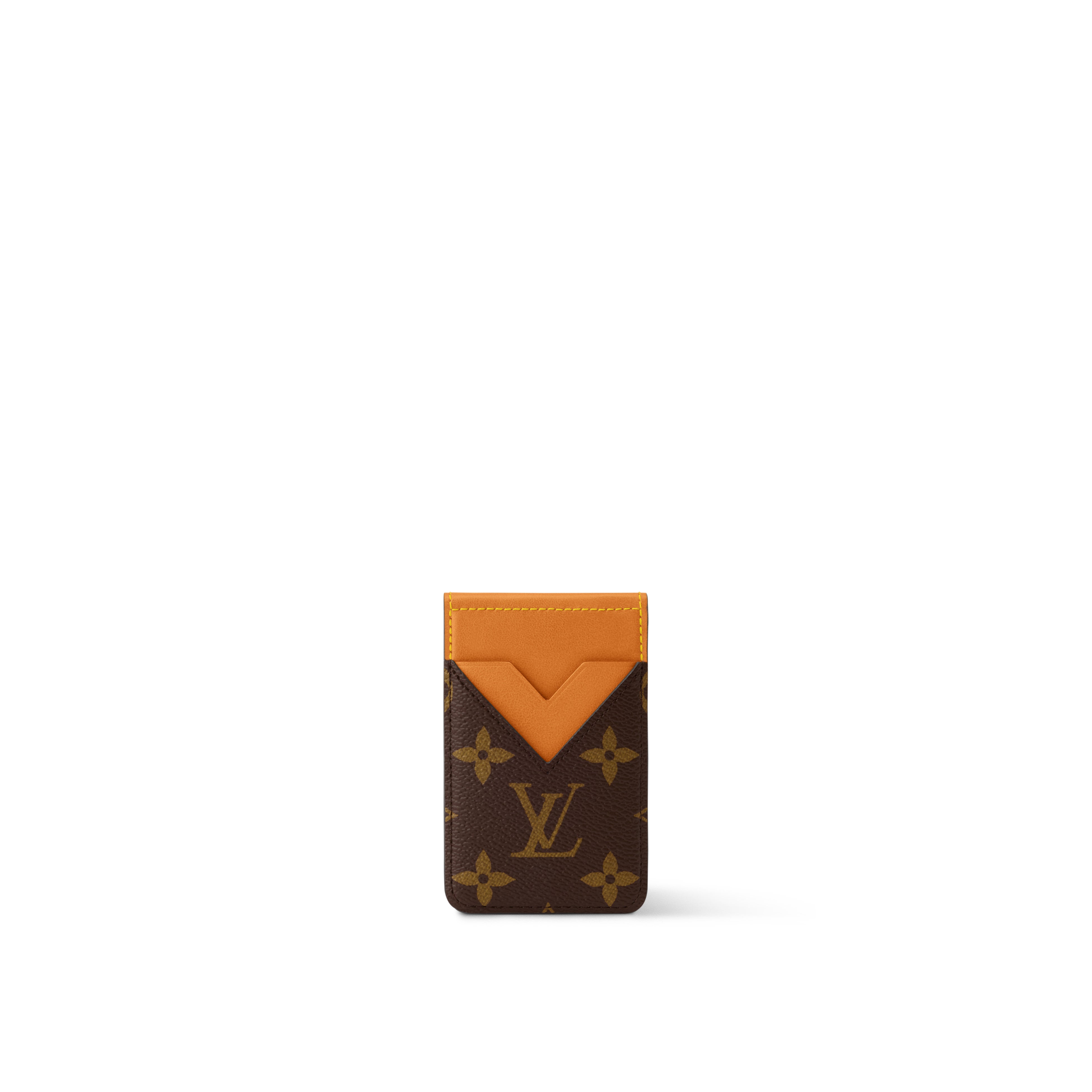 モノグラム・キャンバスに、ヌメ革を組み合わせた「コンパクト・マグネット」。折り畳み式のマグネット付き財布で、iPhoneに装着できるようデザインされています。MagSafeが搭載されたすべてのiPhoneおよびケースに対応し、前面には2つ、内側には3つのカードスロットを備えています。スタンドとしても機能し、フラットな面に置けばiPhoneを立てて使用することができます。