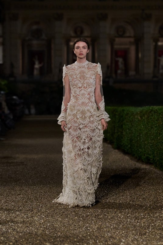 ディオール 2026年クルーズ コレクションで発表された純白のロングドレス。そのサヴォワールフェールに焦点を当てた動画が公開されました。400以上のパーツが1つに重なり合ったドレス製作の起点となるのは、手仕事でカットされた無数のオーガンザです。繊細にカットされたその花びらが一枚ずつ重なり合い、精緻な配置によってまるで彫刻のようなブーケが生まれます。糸、オーガンザ、そしてコードの繊細なバランスの上に成り立つドレスはまるで宙に浮かぶような軽やかさと、儚さを纏っています。