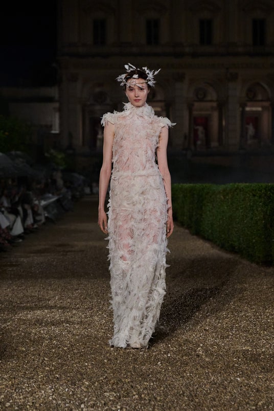 2026年クルーズ コレクションで発表された、純白のレース刺繍が重なるロングドレスの製作風景が公開されました。マリア・グラツィア・キウリが大切にした‟軽やかさ“を、オートクチュールの刺繍職人がレースという素材でその匠の技により再定義しています。まるで小花を一つずつ束ねてブーケを作るように、丁寧にレースを重ねることで、動きのある純白のシルエットが生まれました。この立体的なデザインは、スケッチで描かれた繊細な表現をもとに、伝統的なシャンティレースを使って素材から再解釈したものです。装飾は深みがありポエティックでありながら、一息つくと全体が浮かび上がっていきそうな軽やかな印象を与えます。