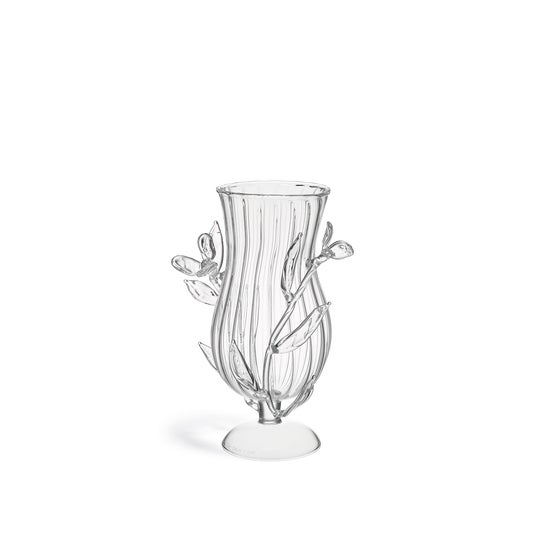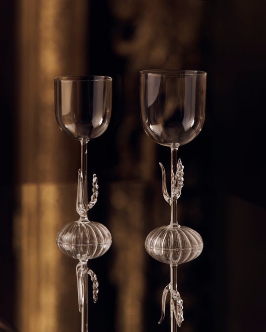 ムッシュ ディオールにとって尽きることのないインスピレーションの源だった自然の美しさに導かれ、このコレクションには、抗いがたい魅力を放つ有機的なフォルムと詩情あふれる植物のモチーフが落とし込まれています。透明な枝、花、そして繊細な葉が、いずれもガラスウェア、キャンドルスティック、花瓶、デコラティブプレートを飾り、まるで魔法にかけられた庭園を散策しているかのような気分を呼び起こします。