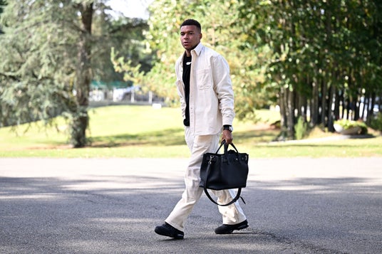 キリアン・エムバペは、ホワイトのコットン コーデュロイの「ディオリン」オーバーシャツに対のパンツ、ブラックのコットンTシャツ、そしてブラックレザーの「ディオール ノルマンディー」バッグをコーディネートしています。