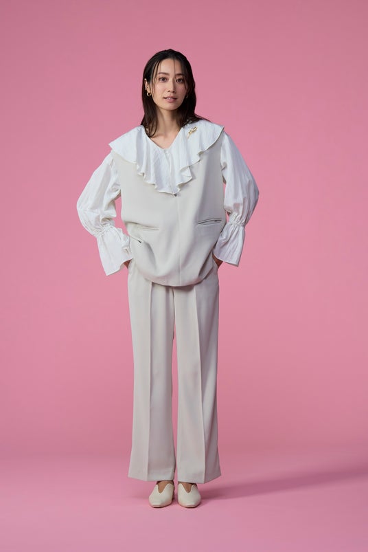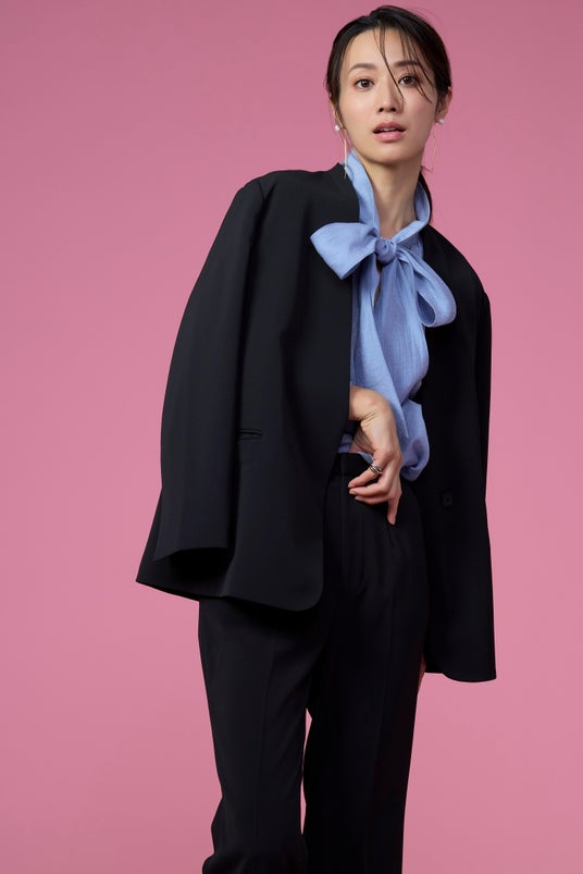 比翼仕立てなので、ボウタイやデザイン性のあるブラウスを合わせやすくしました。