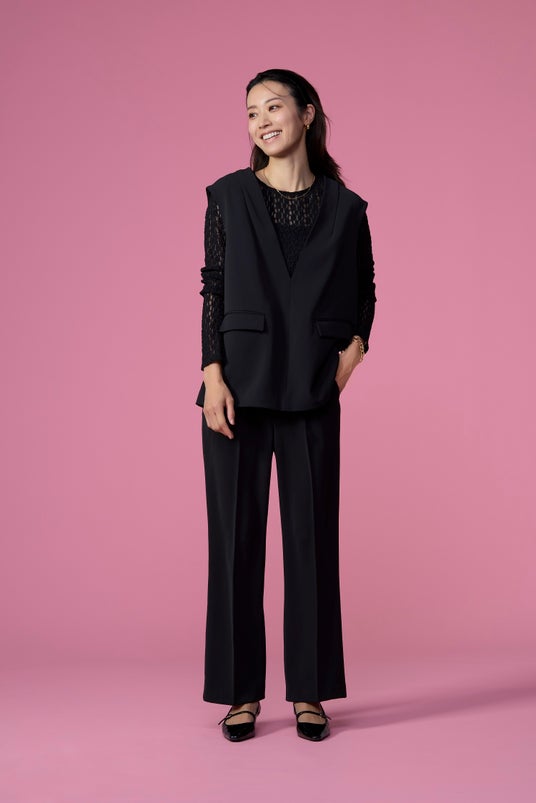 パンツは裏地なしでセンタープレス入りにし、すっきり見えるシルエットに仕立てました。