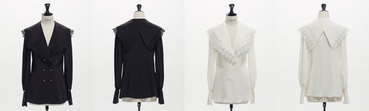 カラーレースシャツ: ブランド初期である 2022 年春夏のアイテムをアップデート。大きなラペルと繊細な刺繍がポイントで、再販希望の声も多かったアイテム。体にフィットするデザインだったものを、リラックス感のあるシルエットにて提案。