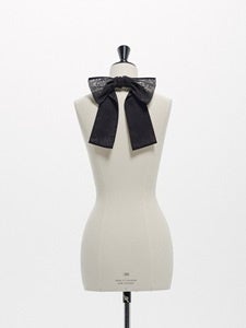 リボンバレッタ: 2024 年秋冬から作り始めたヘッドピースの一つ。次のコレクションでも使用するリネンライクなシアー素材を採用し、大人も着けやすいよう少しカジュアルな印象に仕上げた。