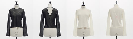 レースニットトップス: 毎シーズン色々な編み地や糸で制作しているレーシーなニットシリーズ。ボディスーツで提案していたものを、トップス型にすることでより幅広いスタイリングが可能。