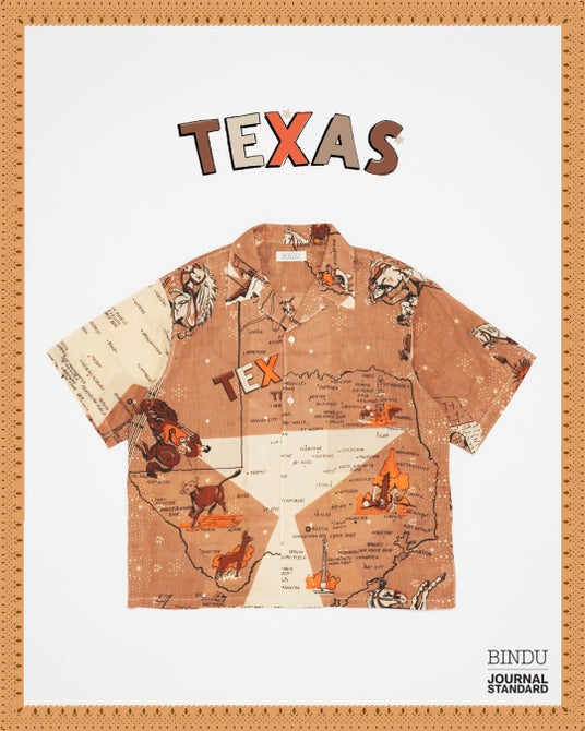 本企画で4回目となる〈BINDU〉別注ショートスリーブシャツは、インラインで展開されているヴィンテージライクなスーベニールマップ柄をベースに、数十種類の中から厳選したバンダナ柄をミックスしたスペシャル仕様。マップ柄に合わせてバンダナのサイズ変更や描き加え、色調整を施すことで、奥行きのあるグラフィックへと昇華させています。