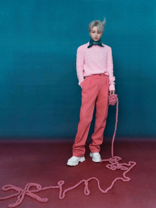 リウ・ユーシンは、淡いピンクのケーブル編みディテールと、刺繍をあしらったカシミア製クルーネックに、レザーパッチがあしらわれた赤のコットンツイルチノパンツを合わせ、ブルーのウォッシュドコットンキャンバス製の大きなノットネックバンドでアクセントを加えたスタイルを披露しました。