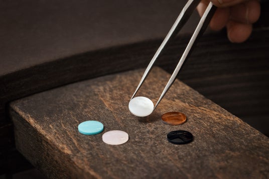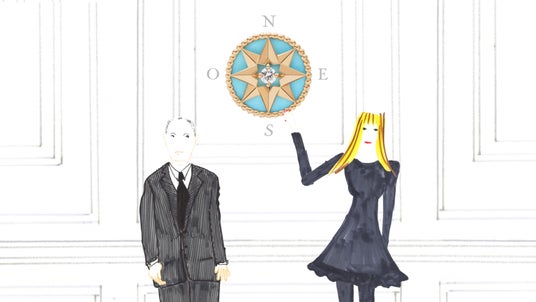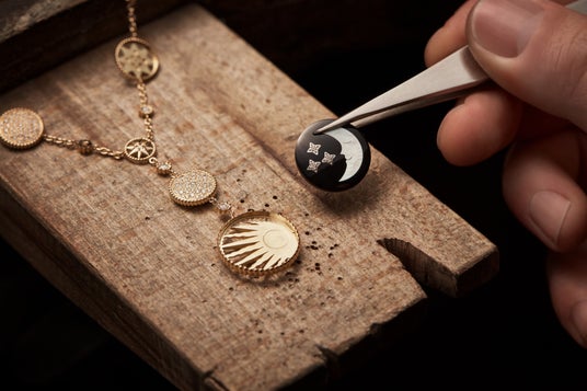 ヴィクトワール・ドゥ・カステラーヌはコンパスローズからインスピレーションを得て、中央にダイヤモンドをあしらい、ビーズ状のライスグレーンモチーフで囲んだメダイヨンの中に配することで、風配図のシルエットを表現しました。モザイク装飾にオマージュを捧げ配置されたストーンは、色によってそれぞれ異なる旅を表現しているかのようです。