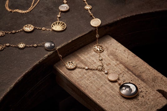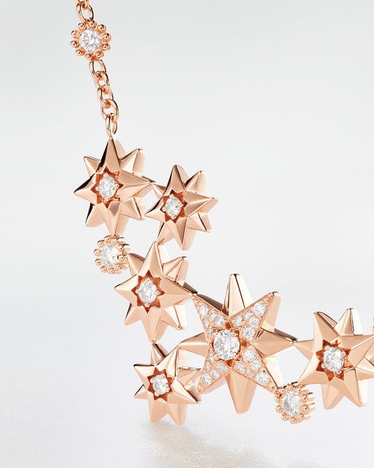 「ローズ デ ヴァン」の詩情豊かな旅は、「ローズ セレスト」が加わり変化を遂げます。宇宙を物語る「ローズ セレスト」には、ヴィクトワール・ドゥ・カステラーヌが好む、優しく丸みを帯びたシルエットのストーンが配されています。彼女は動画の中でクリエイションを「月と太陽の隠れんぼ」と表現しています。
